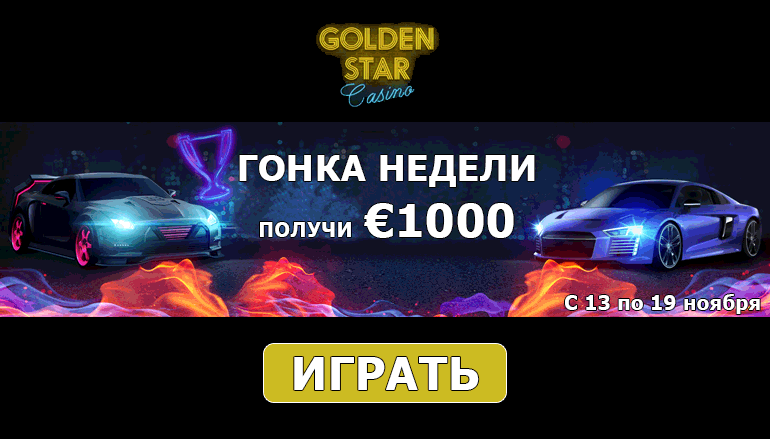 Успей стать обладателем главного приза! Предложение действует с 13 по 19 ноября 2017 года. Делай вложение в любой валюте, а по завершению турнира ты получишь свой бонус. Не забудь его отыграть с вейджером х3. Гонка уже началась, успей догнать и обогнать других участников! Начни сейчас, и вознаграждение в крупном размере до 1000 евро в гонке слотов в казино Голден Стар обязательно достанется именно тебе!