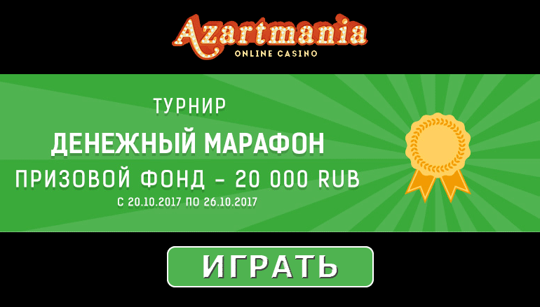Пока кто-то ломает голову над тем, как быстро, а главное с удовольствием, заработать, зарегистрируйся на сайте онлайн казино Азартмания! Это и будет твоим залогом успеха. Тебе распахнутся врата в мир игр и крупных выигрышей! Прими участие в турнире «Денежный марафон» и получи до 20 тысяч рублей в казино Азартмания! Предложение действует с 20 октября 12:00 по 26 октября 23:59 часов по московскому времени.