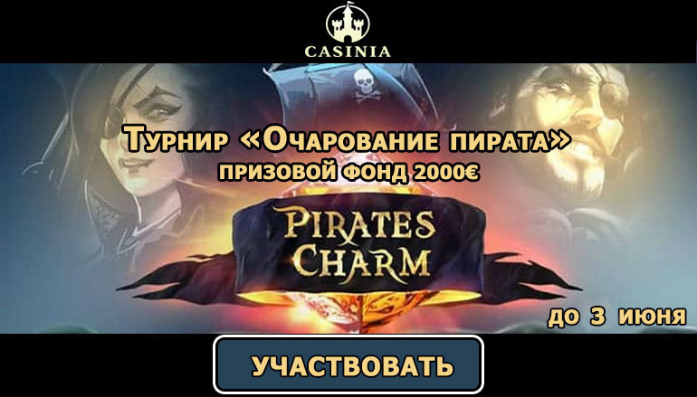 Турнир «Очарование пирата» проходит с 28 мая по 3 июня включительно. Скорее регистрируйтесь на сайте онлайн казино Казиния и отправляйтесь на поиски пиратских сокровищ! Играйте на новом слоте Шарм пирата (Pirates Charm) от компании Quickspin, набирайте специальные баллы и продвигайтесь вперед по турнирной таблице. От участников соревнования не требуется выплаты дополнительных взносов.