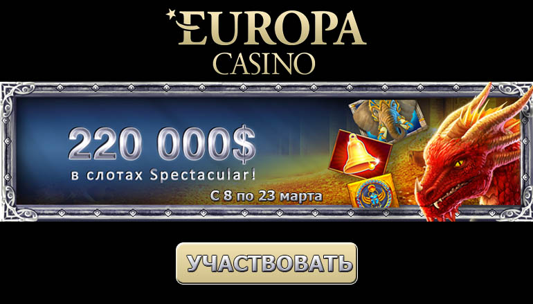 Скорее регистрируйтесь в казино Европа и присоединяйтесь к участникам мартовского турнира с призовым фондом 220 тысяч долларов. В период проведения донной промо акции онлайн казино Европа состоится 3 еженедельных розыгрыша призов! Каждую неделю Вы получите билет за каждую ставку 14 долларов на одном из слотов: Jungle Giants, Jackpot Bells, Dragon Champions, Gladiator Road to Rome, Pharaoh’s Treasure Deluxe и Frankie Dettori: Sporting Legends. Количество билетов и денежных призов не ограничено!