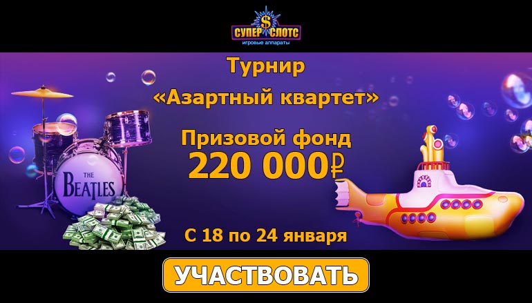 Для всех участников турнира «Азартный квартет» казино Супер Слотс подготовило более 250 игровых автоматов. Выбирайте любой из турнирных слотов и активно играйте в период с 18 по 24 января. По правилам данной промо акции онлайн казино Супер Слотс размер минимальной ставки составляет 10 рублей. Чем больше Вы выигрываете, тем выше поднимаетесь по турнирной таблице!