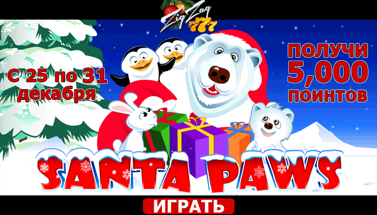 Хочешь познакомиться с Сантой полярного животного мира? Зарегистрируйся на сайте казино ЗигЗаг 777 и стань на шаг ближе к сказке. Для того, чтобы стать обладателем приза в размере до 5 тысяч поинтов в игре Санта-Лапас в казино ЗагЗаг 777, сделай депозит для участия 500 рублей. Не забудь также, что минимальная сумма ставок на участия в турнире составляет 1000 рублей. Чем больше ставок ты сделаешь, тем выше шанс взять главный приз промо акции онлайн казино!