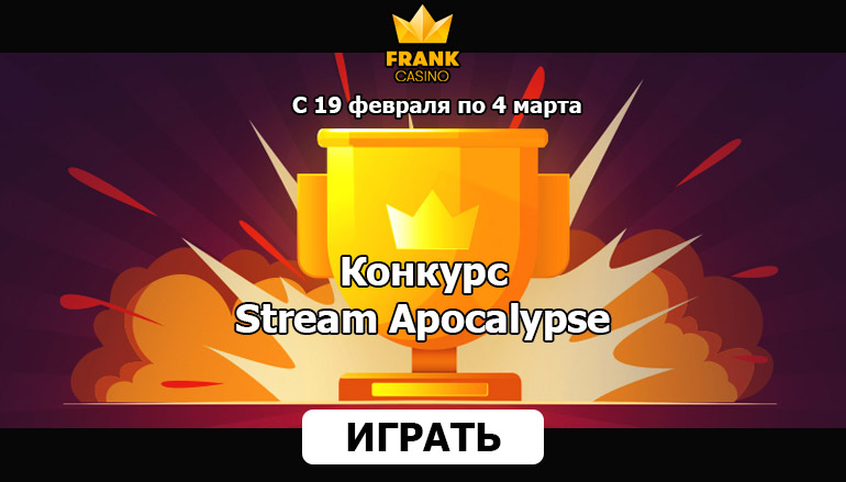 Как давно ты принимал участие в различных конкурсах? На этот раз тебя ждет нечто необычное на сайте онлайн казино в России. Вспомни все, что ты умеешь, ведь тебя ждет участие в конкурсе стримеров Stream Apocalypse. Только там сейчас разыгрываются самые щедрые денежные вознаграждения. Хочешь получить до 50 тысяч долларов в апокалиптическом конкурсе от казино Франк? Тогда ты на верном пути!