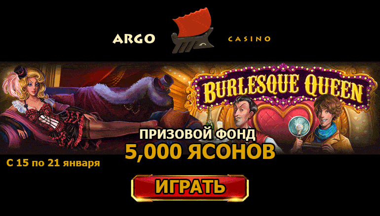 Регистрируйтесь в казино Арго прямо сейчас, чтобы принять участние в турнире «Слот недели» с призовым фондом 5 тысяч ясонов! С 15 по 21 января играйте на слоте «Королева бурлеска». По условиям данной промо акции онлайн казино минимальная сумма ставок для участия в соревновании составляет 1000 рублей, а минимальный депозит – 500 рублей в указанный период.