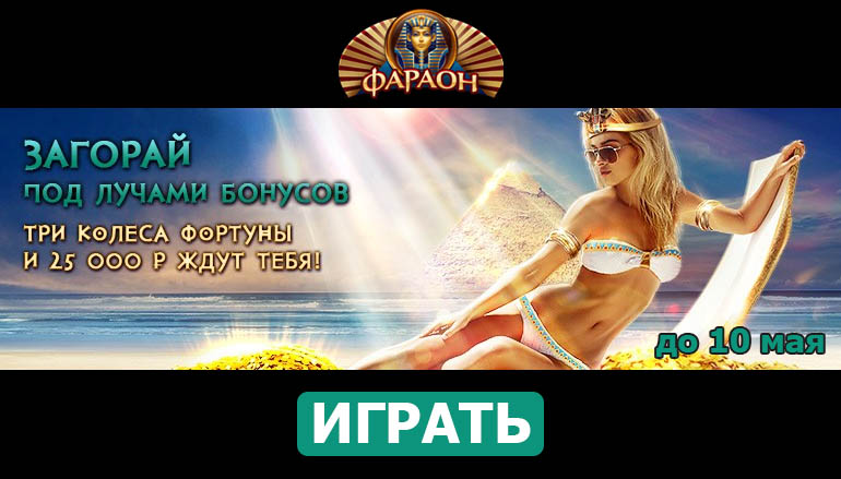 Будьте внимательны, перед тем как внести депозит Вам необходимо активировать бонус в разделе «Акции». Максимальный размер бонуса составляет 25 тысяч рублей! Загорайте под лучами бонусов в казино Фараон Бет! Ну а если Вам интересны и другие промо акции и турниры разных игорных заведений, следите за обновлениями в нашем каталоге онлайн казино.