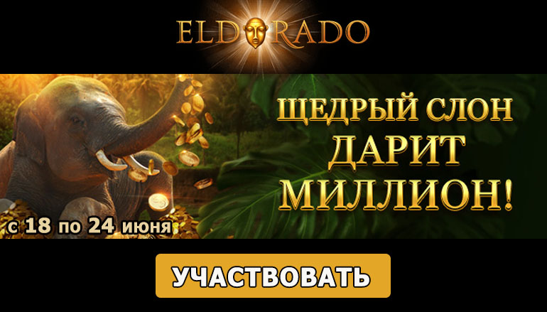 В честь дня защиты слонов казино Эльдорадо24 (Eldorado24 Casino) устраивает грандиозное соревнование с огромным призовым фондом. Все неравнодушные люди могут внести свою лепту в защиту прав этих умных и красивых животных, а заодно и попытаться выиграть приз. Примите участие в лотерее «Слон на миллион» в казино Эльдорадо24 и получите один из крупных денежных призов! Поспешите, на кону один миллион рублей!