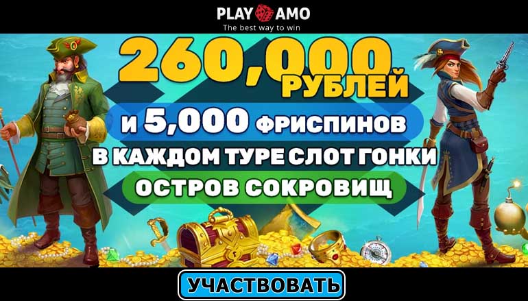 Если Вы хотите провести по-настоящему незабываемый уикенд, то присоединяйтесь к участникам турнира «Остров Сокровищ». Призовой фонд каждого тура соревнования составляет 260 тысяч рублей и 5 тысяч фриспинов! Для того, чтобы заполучить все эти богатства, Вам не потребуется карта сокровищ. Просто наслаждайтесь своими любимыми слотами в казино Плей Амо и выигрывайте потрясающие призы!