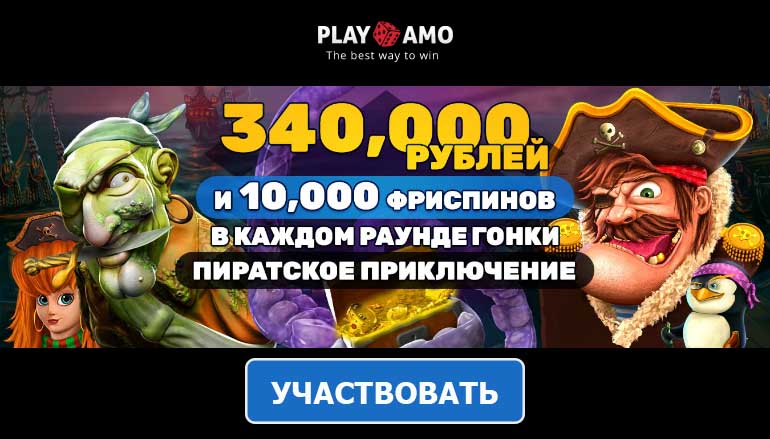 Скорее регистрируйтесь в казино Плей Амо и присоединяйтесь к участникам турнира «Пиратское приключение». Каждую неделю с понедельника по пятницу играйте в свои любимые слоты и получайте за это специальные баллы. Каждая Ваша ставка в размере от 0.1 евро будет засчитываться, при этом, за каждый 1 евро, потраченный на любом из слотов, Вы получите 1 балл. Чем больше у Вас баллов, тем выше вероятность того, что Ваше имя окажется в списке победителей текущего этапа.