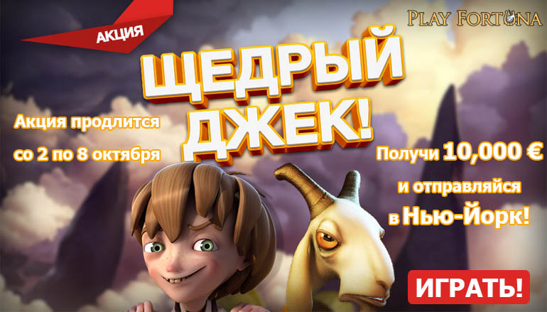 Чем хороши онлайн азартные развлечения? Как минимум тем, что на верно выбранном портале тебя всегда будут ждать щедрые вознаграждения. И одним из таких является сайт онлайн казино Плей Фортуна. На этот раз тебя ждет предложение, от которого не сможет отказаться ни один знаток сайтов онлайн азартных игр в России! Начни играть на слоте «Щедрый Джек» и получи в подарок 10 тысяч евро и поездку в Нью-Йорк от казино Плей Фортуна!
