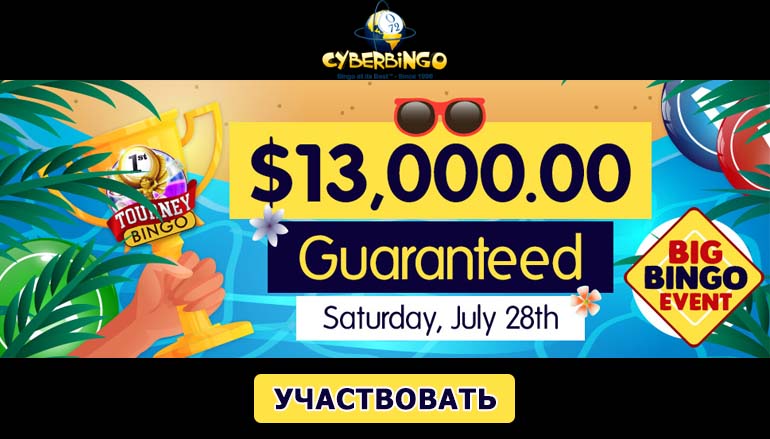 Предложение ограничено, и только в эту субботу, 28 июля 2018 года, 13 тысяч долларов в крупном турнире от Кибер Бинго могут стать твоими! Не пропусти грандиозную раздачу призов, которые положительно скажутся на твоем кошельке. Всего за два доллара ты получишь лотерейный билет, который превратится в 13 тысяч долларов! Все подробности лотереи ты можешь узнать на странице Кибер Бинго, о котором в свою очередь мы рассказали в обзоре Кибер Бинго. Регистрируйся, играй и выигрывай!