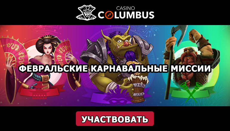 С 11 по 17 февраля участвуйте в турнире «Февральские карнавальные миссии». Мероприятие состоит из трех этапов, проходите каждый из них и выигрывайте деньги или незабываемую поездку в Рио-де-Жанейро на двоих! Скорее присоединяйтесь к участникам соревнования, вступайте в борьбу за кеш призы и тур в Рио в казино Колумб! Готовьте костюм, ведь именно Вам может достаться главный приз – путешествие на родину самого ярчайшего и широкомасштабного в мире карнавала!