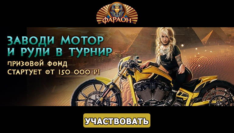 С 26 августа по 1 сентября включительно участвуйте в захватывающем турнире с динамическим призовым фондом, который стартует от 150 тысяч рублей. Поспешите, только десять самых быстрых игроков получат денежные призы от казино Фараон Бет в День рождения мотоцикла. Разгоняйтесь и летите к победе! Не упустите потрясающую возможность подкатить к своей мечте еще на пару километров ближе!