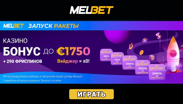Регистрируйтесь сейчас и запускайте ракету с супер бонусами от Мелбет! Ну а для того, чтобы узнать о других бонусных предложениях и промо акциях данного игорного заведения, ознакомьтесь с нашим обзором Мелбет.