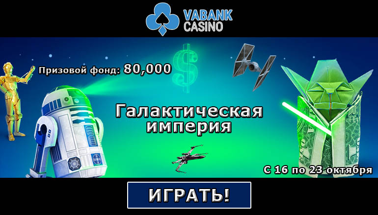 До сих пор ломаешь голову над тем, как легко, быстро, а главное с удовольствием заработать денег? У сайта онлайн азартных игр казино ВаБанк (VaBank casino) есть для тебя отличное предложение! Твои друзья и знакомые убивают на работе дни напролет? Чувствуешь себя офисным планктоном, получая при этом копейки? Скажи НЕТ безденежью с любимым сайтом онлайн казино в России. Не выходя из дома, заработай до 80 000 рублей в турнире «Галактическая империя» в казино ВаБанк! Ощути все преимущество азартных игр.